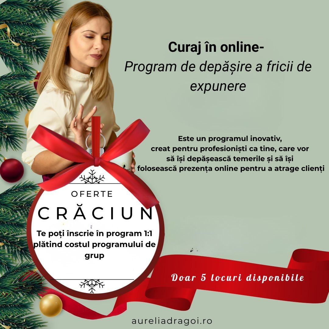 „Curaj în Online” este programul inovativ, creat pentru profesioniști ca tine, care vor să își depășească temerile și să își folosească prezența online pentru a atrage clienți și oportunități. Acum în Decembrie poți intra în programul individual la același cost ca în programul de grup. Adică 2459 lei cu o primă transă de 820 lei. Ofer acest cadou doar pentru 5 participanți.